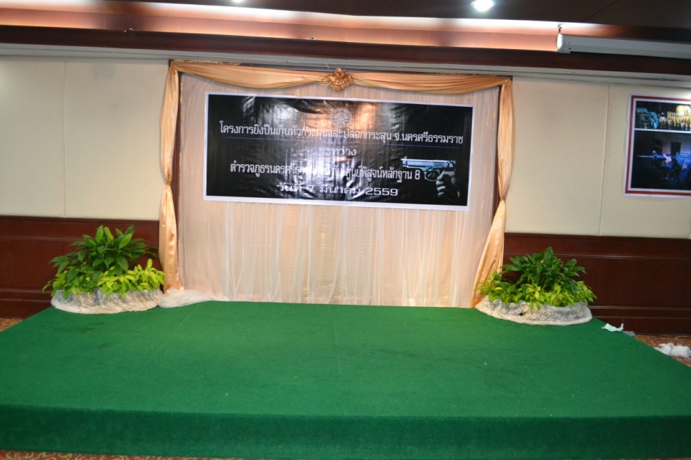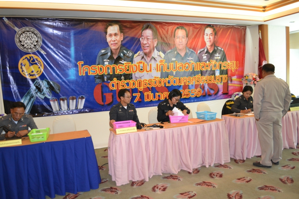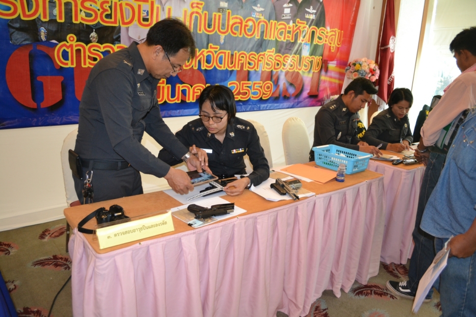 พฐ.จว.นศ. เข้าร่วมโครงการทดสอบสมรรถภาพผู้ได้รับอนุญาตให้มีและใช้อาวุธปืน (โดยยิงเก็บหัวกระสุนและปลอกกระสุน) ของ ภ.จว.นศ.ที่โรงแรมทวินโลตัส นครศรีฯ (7 มี.ค.59)