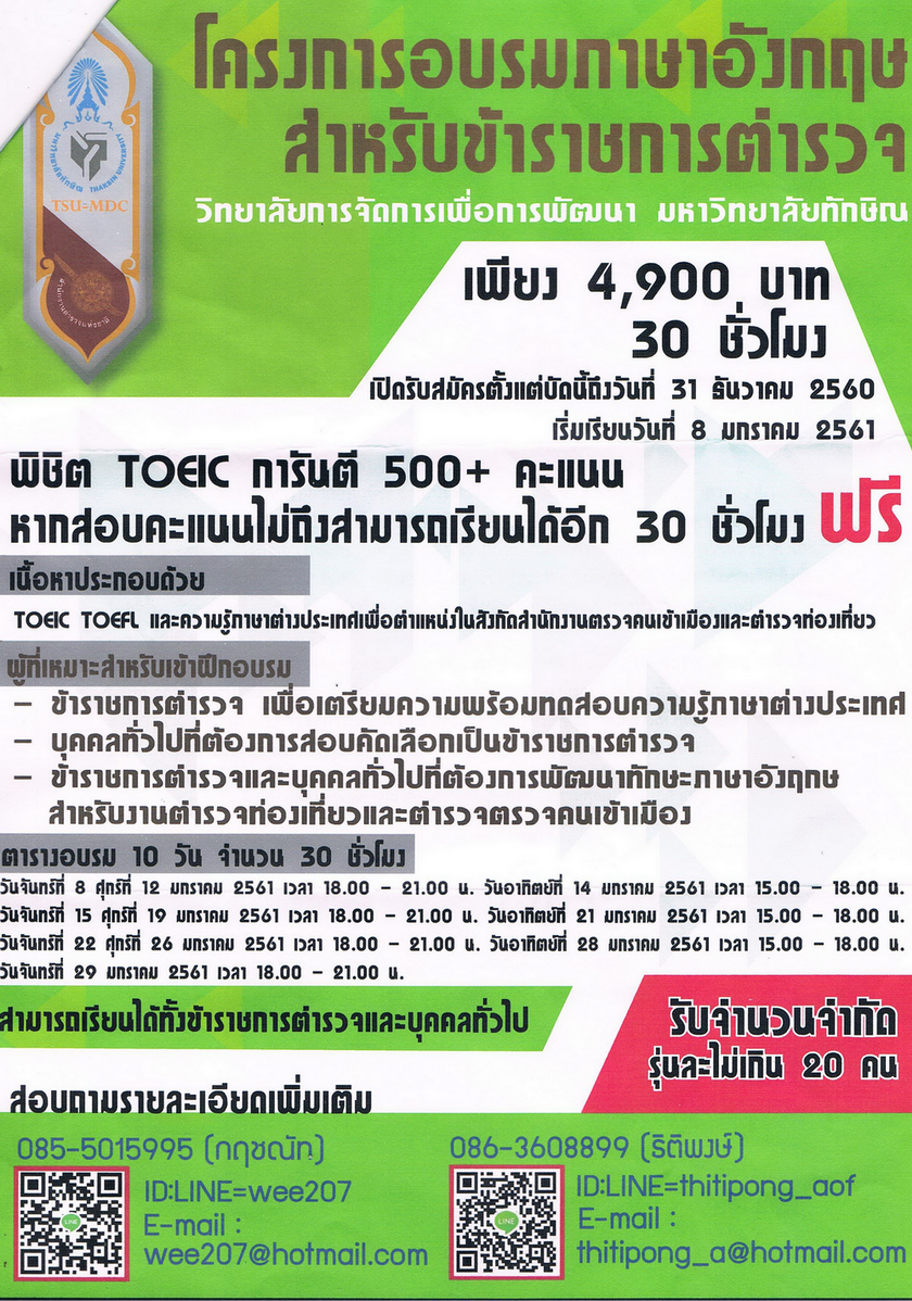 โครงการอบรมภาษาอังกฤษสำหรับข้าราชการตำรวจ วิทยาลัยการจัดการเพื่อการพัฒนา มหาวิทยาลัยทักษิณ  เพียง 4,900 บาท 30 ชั่วโมง เปิดรับสมัครตั้งแต่บัดนนี้ถึงวันที่ 31 ธันวาคม 2560